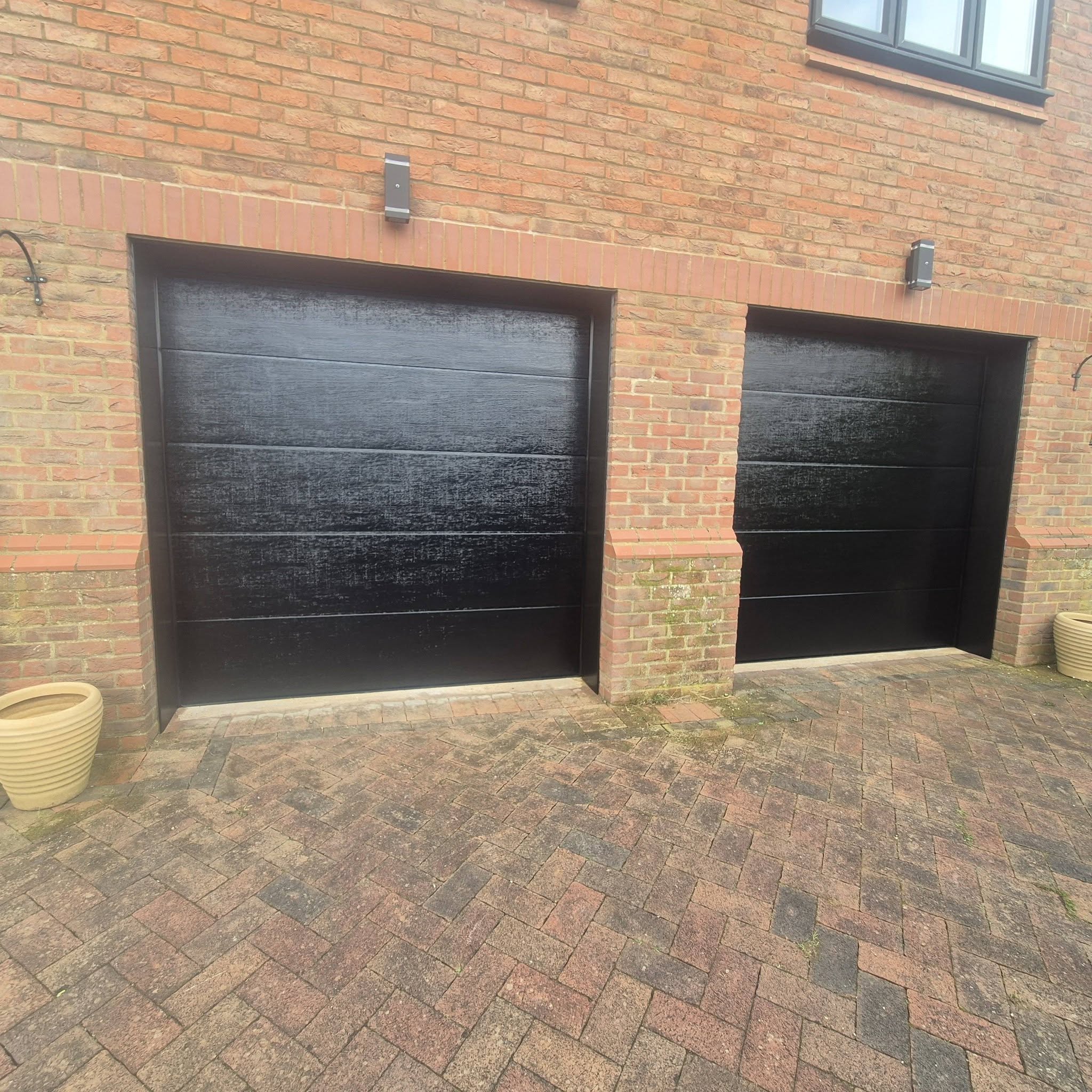 The project featured the installation of two Novoferm ISO45 flush ribbed sectional garage doors, finished in a striking black woodgrain embossed panel for a premium, textured appearance. Each door was fitted with a Novomatic operator, providing smooth, quiet automation and dependable day-to-day convenience.