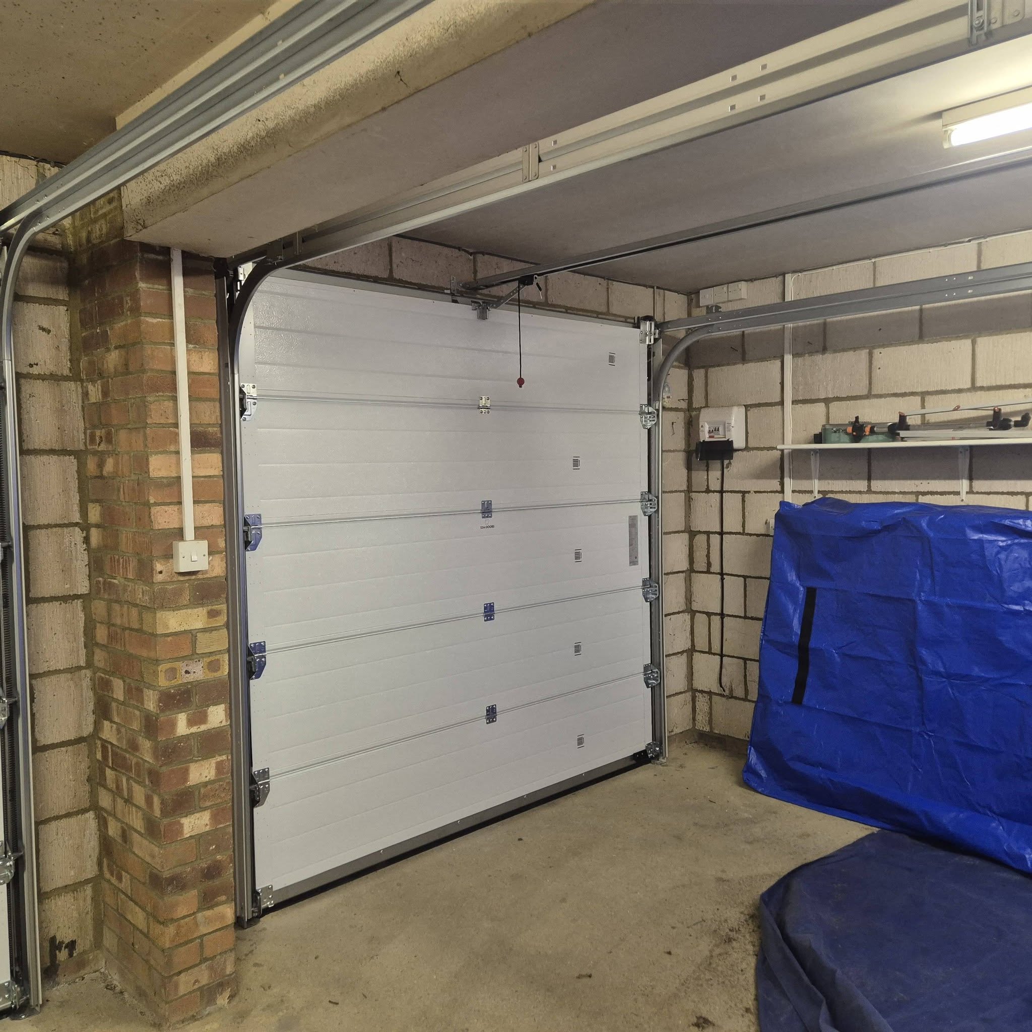 We replaced old double garage doors with new sectional doors and a composite side door.